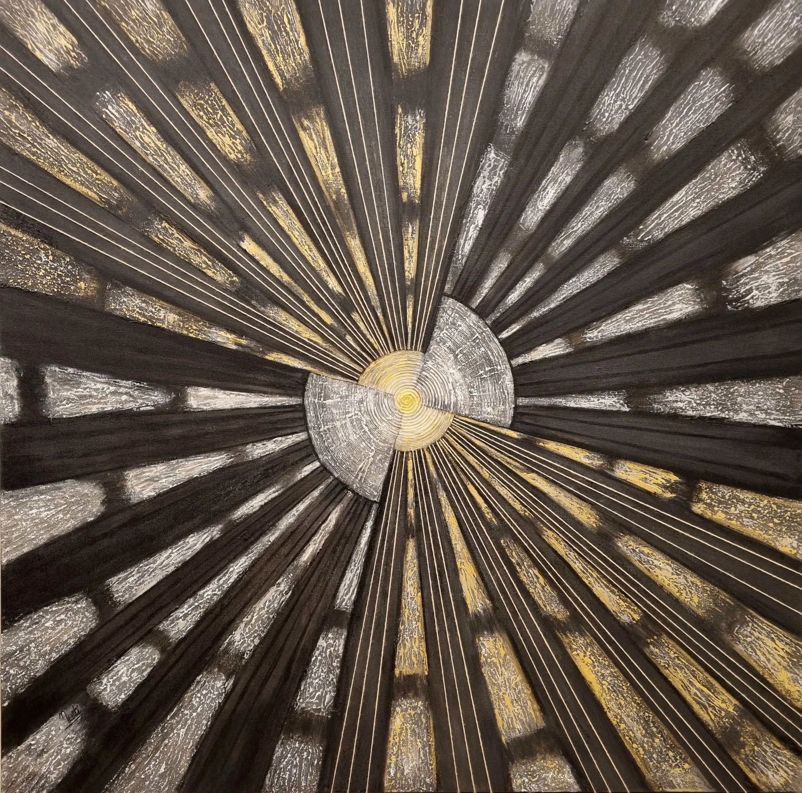 It embodies the concept of the wheel of time and the constant evolution with the central circle symbolizing the source of energy. Radiating lines depict the flow of energy, phases of growth and transformation, like the metamorphosis of a butterfly. The duality of warm and cool, the physical and spiritual, invite viewers to reflect on their journey in the eternal cycle, and the beauty of the present.